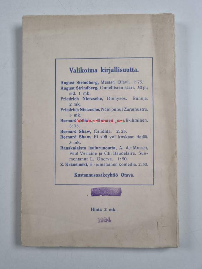 Hyvä. Selkämyksessä aavistus vinoutta, kansien reunoilla taittumaa (koska ohuehkot kannet sivuja leveämmät), sivut vielä leikkaamatta auki eli lukematon kirja