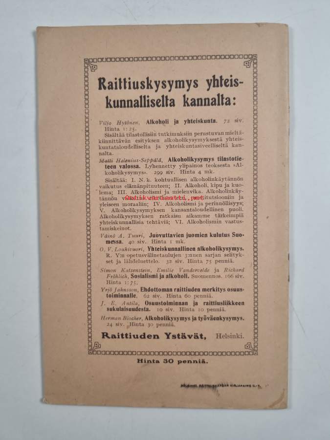 Alas alkoholi, kansan turmio - Suomen Opettajain Raittiusliiton kilpakirjoituskirjasia nr 36