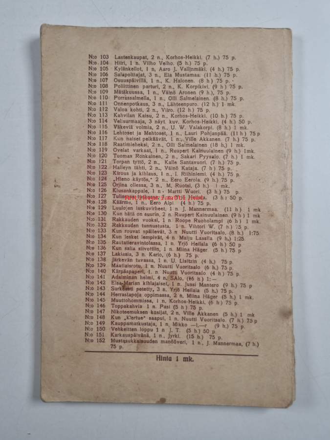 Kihlaus ; Lemmennosto ; Juhannusaattona ; Herra Koulumestari ; Syiden kirous ; Salaliitto ; Lautamieheksi ; Työväen elämästä ; Retusen velkojat ; Juhannus-iltana