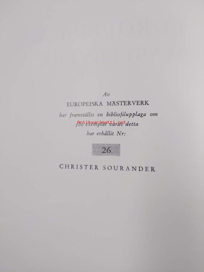 Hyvä. Tarkempi kuntoluokka: K3+ ; Hieman käytön jälkeä kansissa, selkämyksessä aavistus vinoutta. nro 26/500 ; sivujen syrjillä kultaus