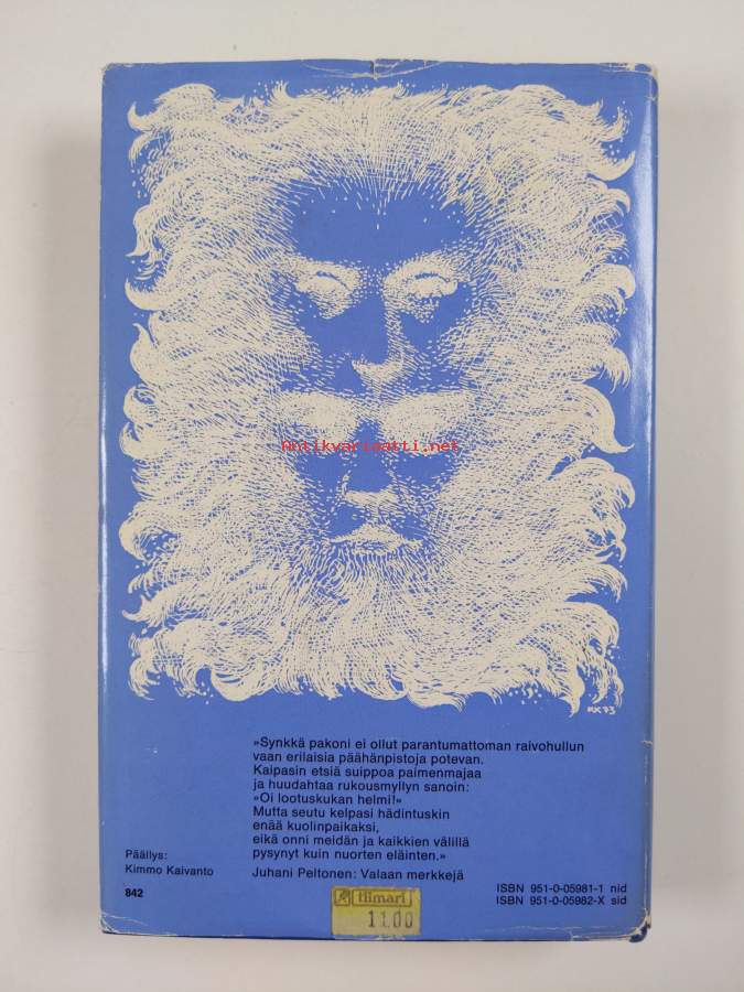 Hyvä. Tarkempi kuntoluokka: K3+ ; Pienoista kulumaa kansissa, selkämyksessä aavistus vinoutta, takana vanha hintalappu. Kansipaperin kunto: repeämiä/kulumaa