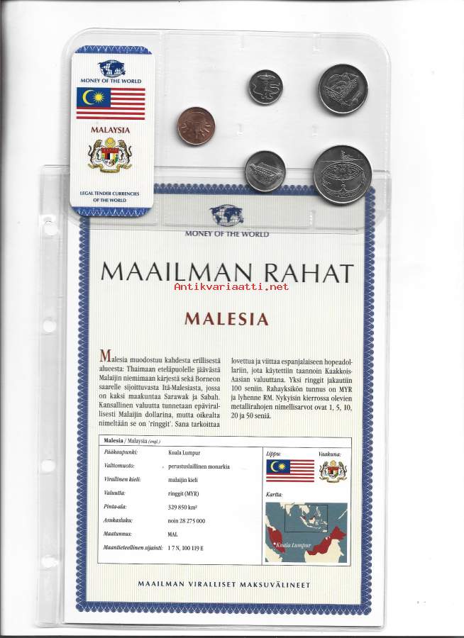 Malesia 1,5,10,25 ja 50 sen 5 kpl rahasarja 1991-2008 ulkomainen kolikko