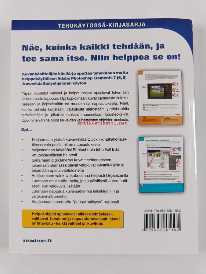 Muu(t) tekijä(t): Tapani LahtinenSarja: Tehokäytössä-kirjasarjaAlkuteos: Easy Adobe Photoshop Elements 7Asiasanat: värit, valokuvat, digitaalitekniikka, kuvankäsittely, retusointi, tietokonegrafiikka, Photoshop, tietokoneohjelmat, sähköinen julkaisutoiminta, sähköinen arkistointi, tehosteet