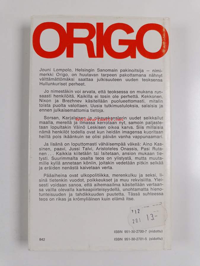 Hyvä. Hieman kulumaa kansissa, takana vanha hintalappu, selkämyksessä hieman vinoutta. Kansipaperin kunto: pientä kulumaa