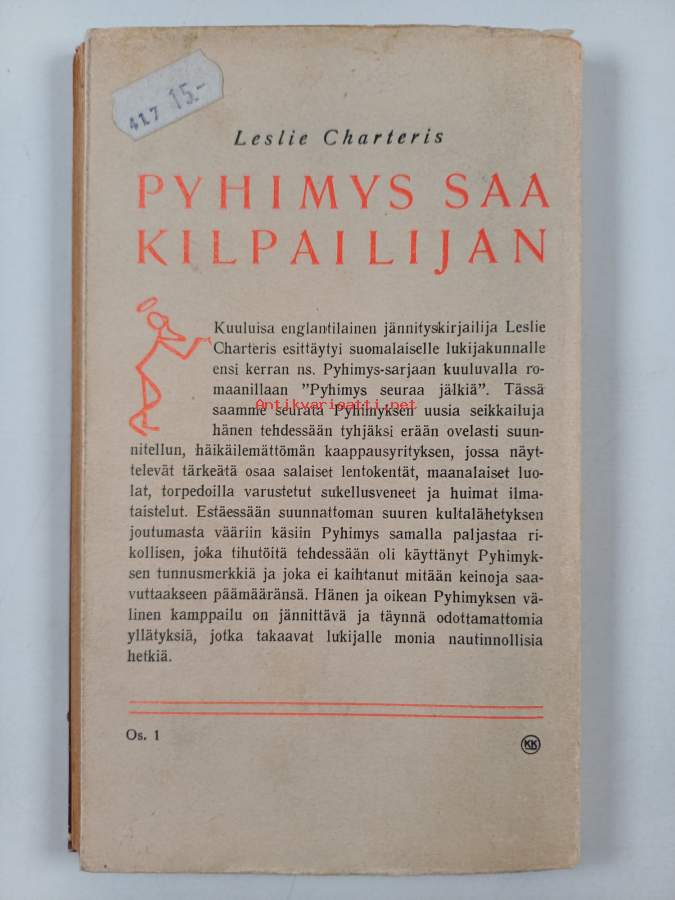 Pyhimys näkee unia, 1965. 1. painos.Pyhimys eli Simon Templar on todella erilainen kuin muut rikosromaanien sankarit. Hän on eräänlainen nykyajan Robin Hood,