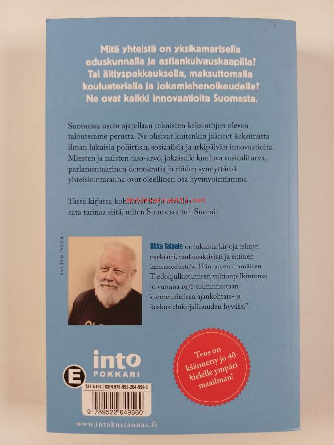 Muu(t) tekijä(t): Riitta Uosukainen, Ilkka Taipale ym.Sarja: Into-pokkariAsiasanat: suomalaisuus, elämäntapa, arkielämä, kansainvälistyminen, hyvinvointivaltio, yhteiskuntapolitiikka, kulttuuripolitiikka, keksinnöt, kansalaisyhteiskunta, sosiaalipolitiikka, terveyspolitiikka, julkinen hallinto, sosiaaliset innovaatiot, sosiaalitekniikka
