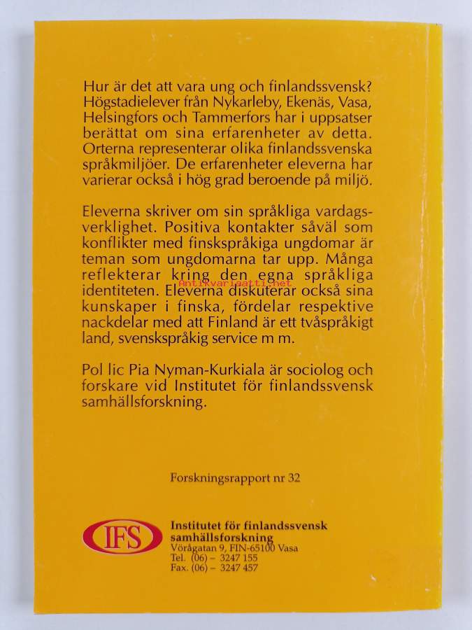 Sarja: Forskningsrapport / Institutet för finlandssvensk samhällsforskning nr 32Asiasanat: nuoret, koululaiset, identiteetti, suomenruotsalaiset, suomenruotsalaisuus, ruotsinkieliset, äidinkieli, kaksikielisyys, kielelliset vähemmistöt