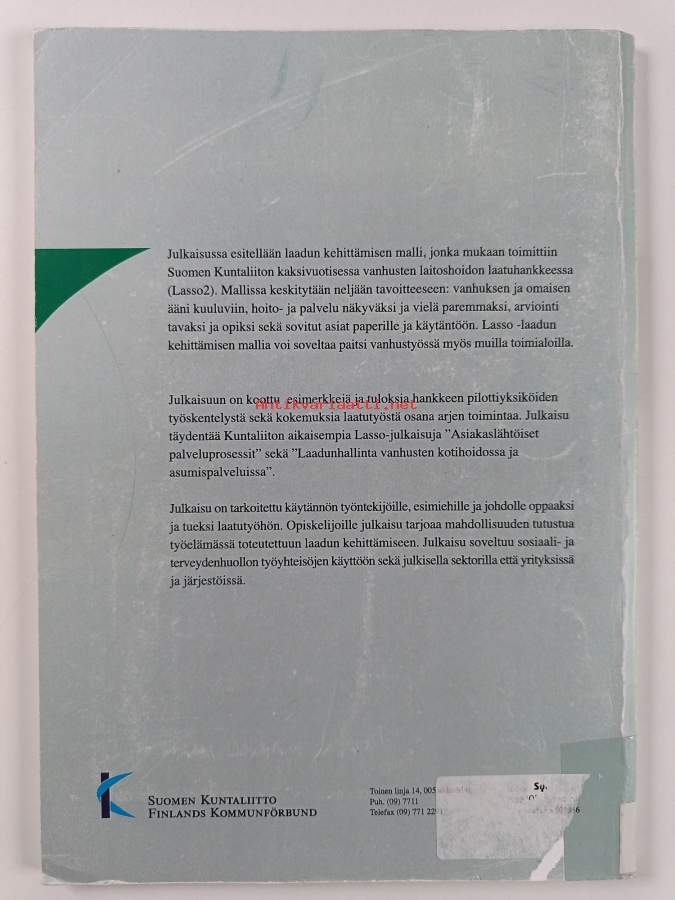 Sarja: LassoAsiasanat: asiakaslähtöisyys, asiakkaat, palvelut, arviointi, hoito, kehittäminen, laatu, laitoshoito, hoitotyö, prosessit, kunnat, ikääntyneet, vanhustenhuolto, itsearviointi, sosiaalipalvelut, työprosessit, kehittämisprojektit, väestörakenne, vanhuspolitiikka, laatujärjestelmät, laatutyö, väestöennusteet, vanhustyö, palaute, laadunhallinta, kirjaaminen, auditointi, suositukset, vanhustenhuoltolaitokset, dokumentointi, Quality Control, Quality of Health Care, hallintoalueet, Aged, health services for the aged, Geriatric Nursing, social work, vertaisarviointi (arviointimenetelmät), Institutionalization, quality assurance, health care
