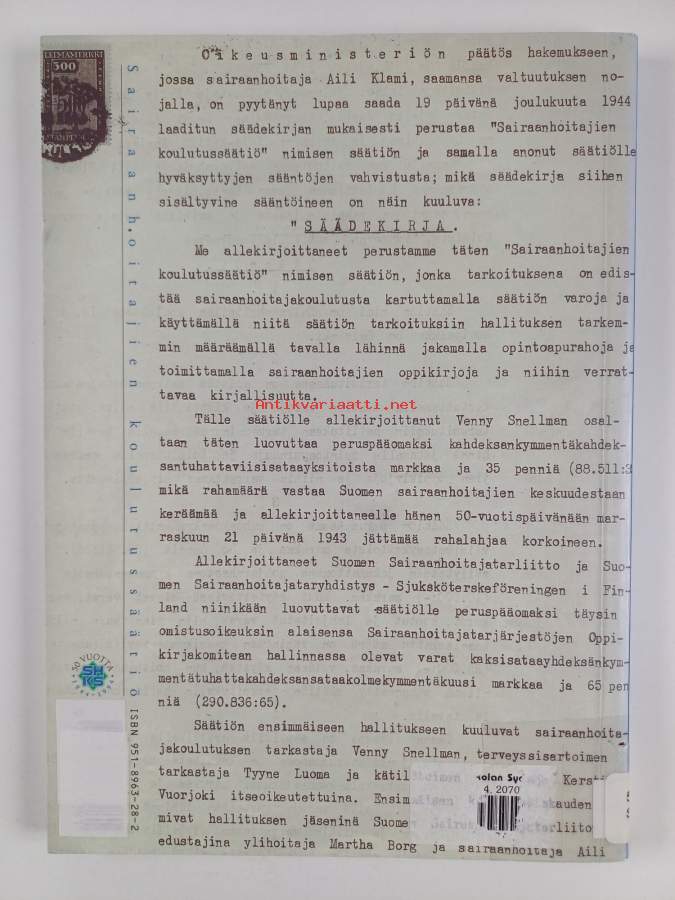 Muu(t) tekijä(t): Aino Maria Havanto, Ulla Siivola ym.Asiasanat: historia, järjestöhistoriikit, historiikit, koulutus, säätiöt, hoitotyö, bibliografiat, hoitohenkilöstö, sairaanhoitajat, sairaanhoito, oppimateriaali, ammatillinen koulutus, oppikirjat, julkaisutoiminta, terveydenhuoltohenkilöstö, julkaisut, terveysala, läroböcker, organisationshistoriker, utbildning, sjukskötare, läromedel, education, nursing, bibliografier, vårdarbete, stiftelser, yrkesutbildning, sjukvård, historiker (verk), publikationer, publikationsverksamhet, vårdpersonal, hälsovårdsbranschen, hälsovårdspersonal, Societies, Nursing