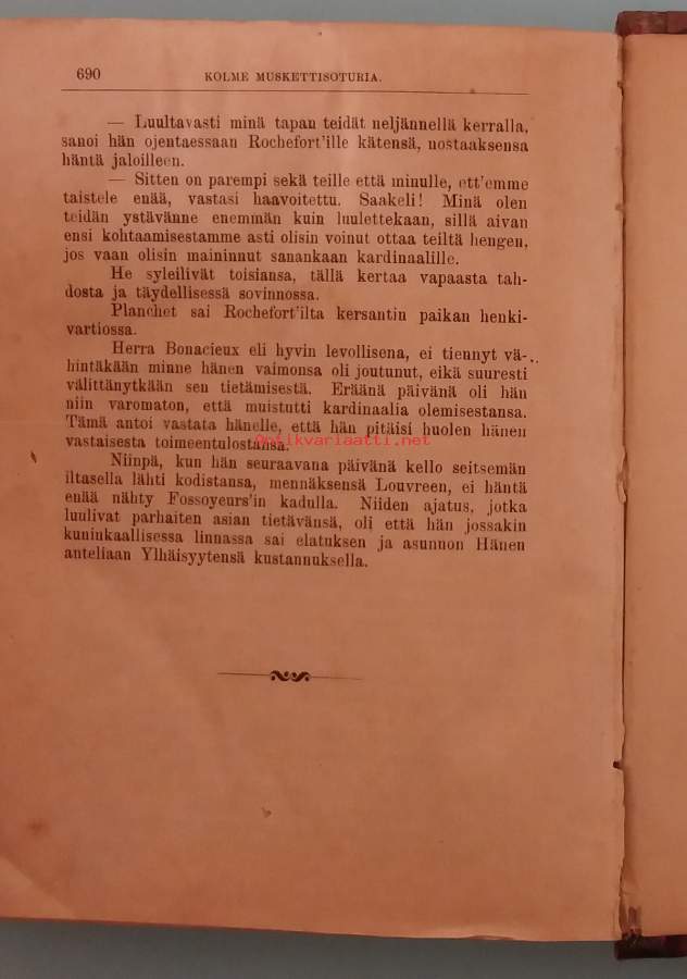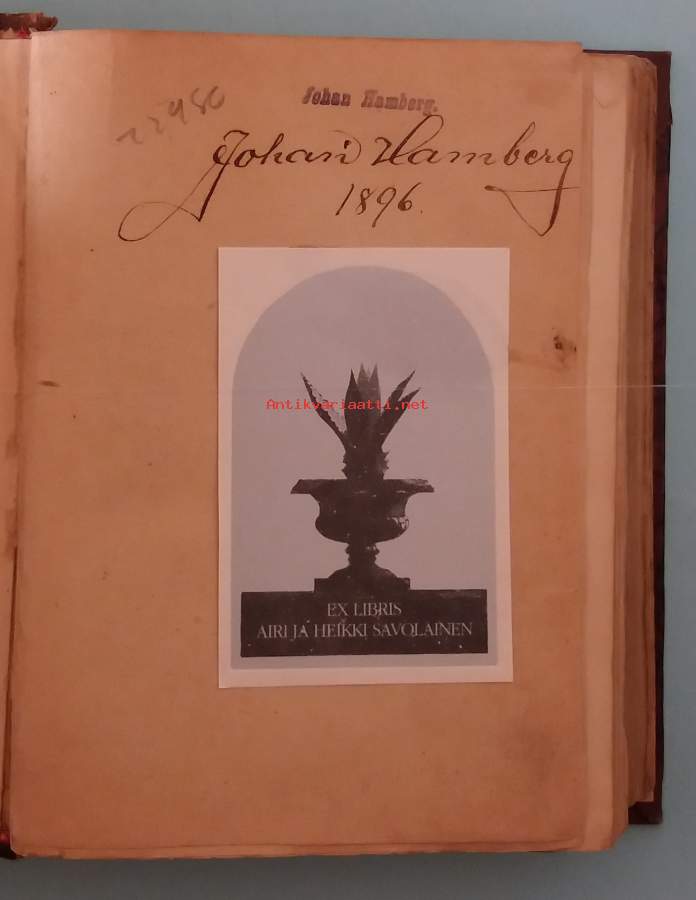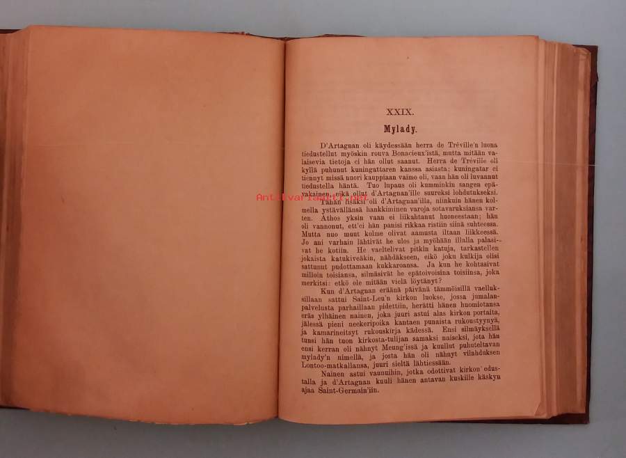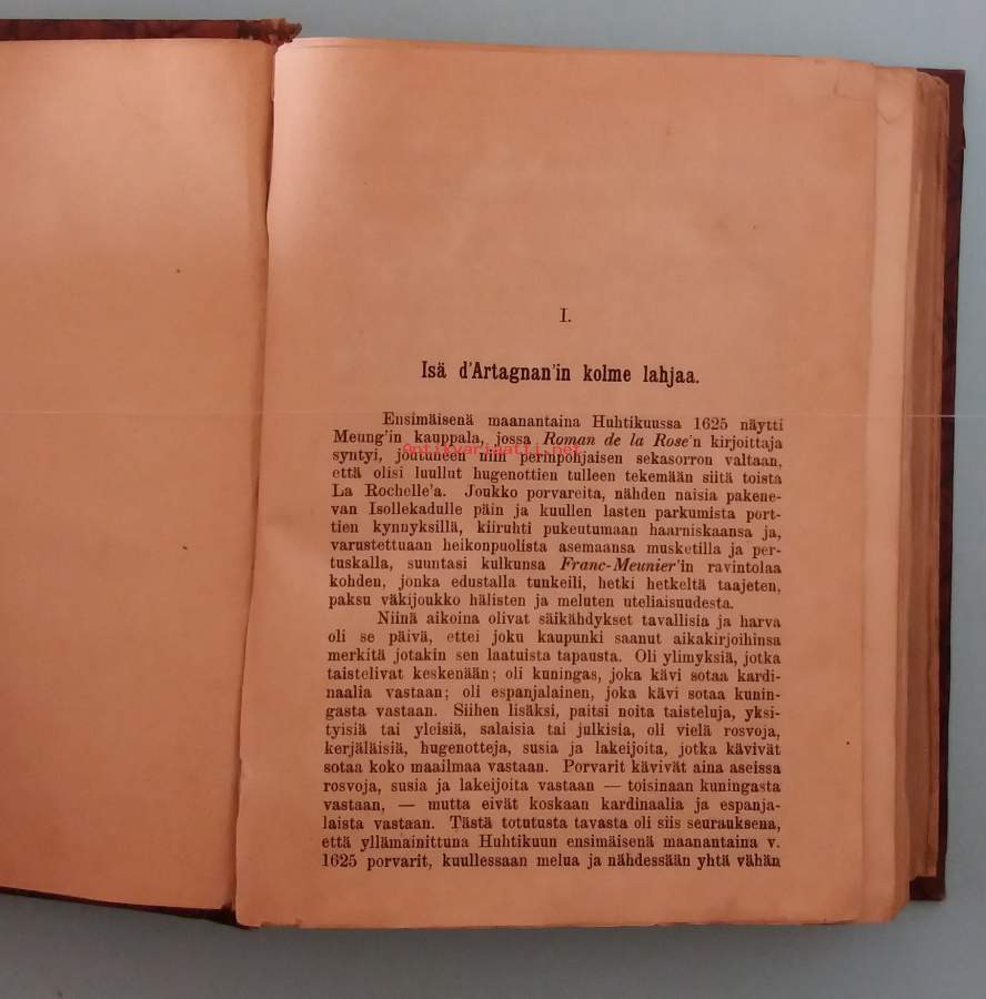 Omistajamerkinnät: Johan Hamberg 1896 - viittaa 1800-luvun lopun tai 1900-luvun alun käännökseen. Vanha suomennos, mahdollisesti ensimmäisiä Dumas’n käännöksiä Suomessa ?????? Dimensiot 17 ¤ 13 cm.