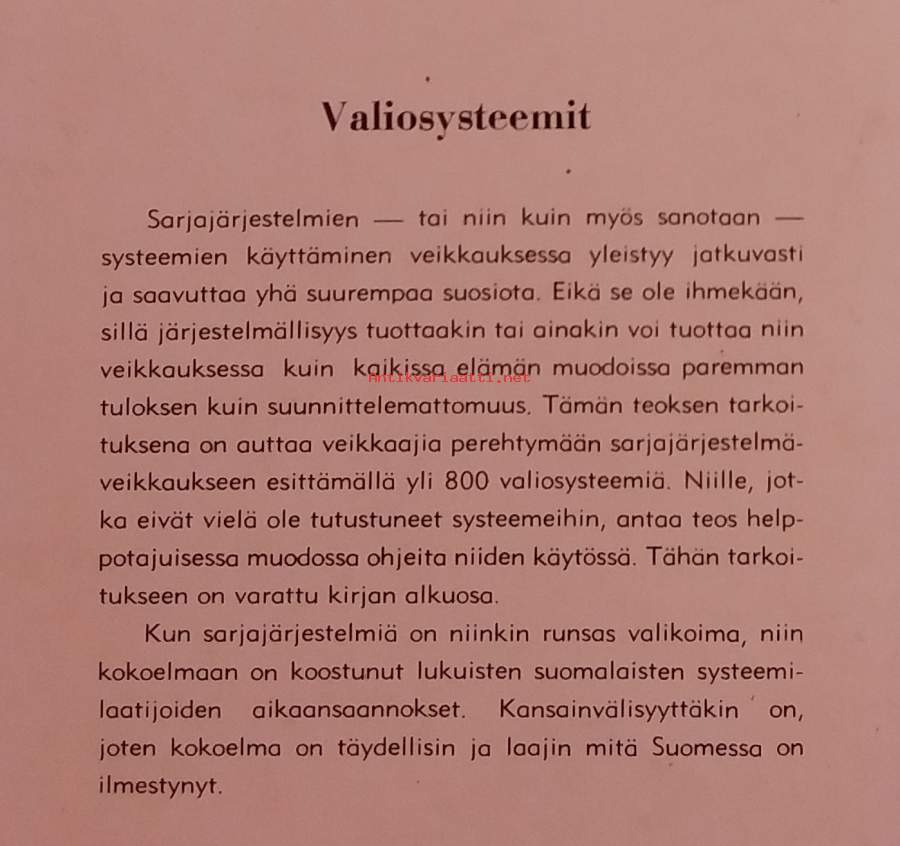 Teoksen tarkoituksena on auttaa veikkaajia perehtymään sarjajärjestelmäveikkaukseen esittämällä yli 800 valiosysteemiä: sisältäen siis erilaisia järjestelmiä ja strategioita vedonlyöntiin. Dimensiot 21 ¤ 15 cm.