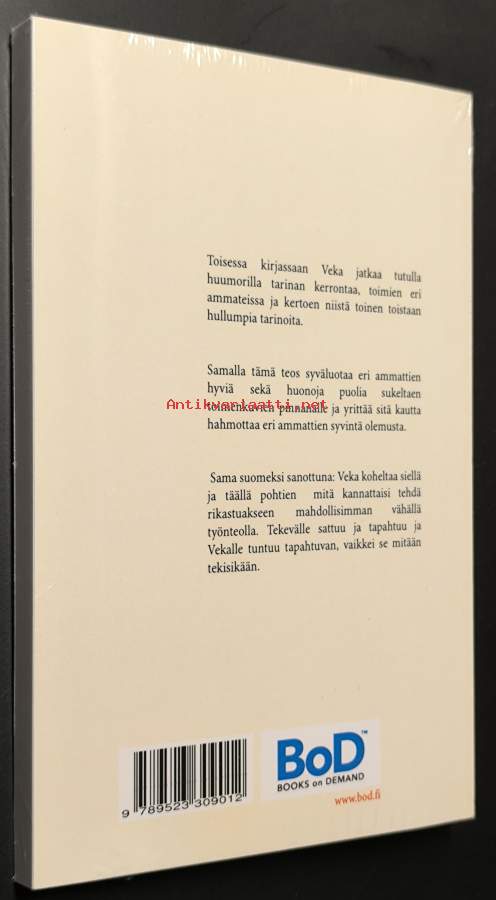 "Toisessa kirjassaan Veka jatkaa tutulla huumorilla tarinan kerrontaa, toimien eri ammateissa ja kertoen niistä toinen toistaan hullumpia tarnoita" -lainaus takakannesta.