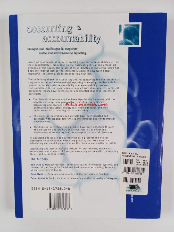Muu(t) tekijä(t): Carol Adams, Dave OwenAsiasanat: yritykset, yritystoiminta, teollisuus, laskentatoimi, organisaatiot, sosiaalinen vastuu, ympäristövaikutukset, yhteiskunnalliset vaikutukset, sosiaaliset vaikutukset, toimintakertomukset, raportit