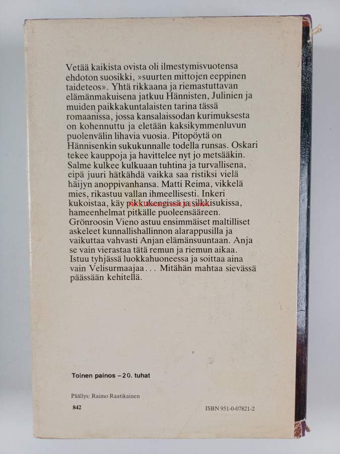 Hyvä. Pienoista nuhruisuutta, selkämyksessä hieman vinoutta. Kansipaperin kunto: joitain repeämiä/kulumaa