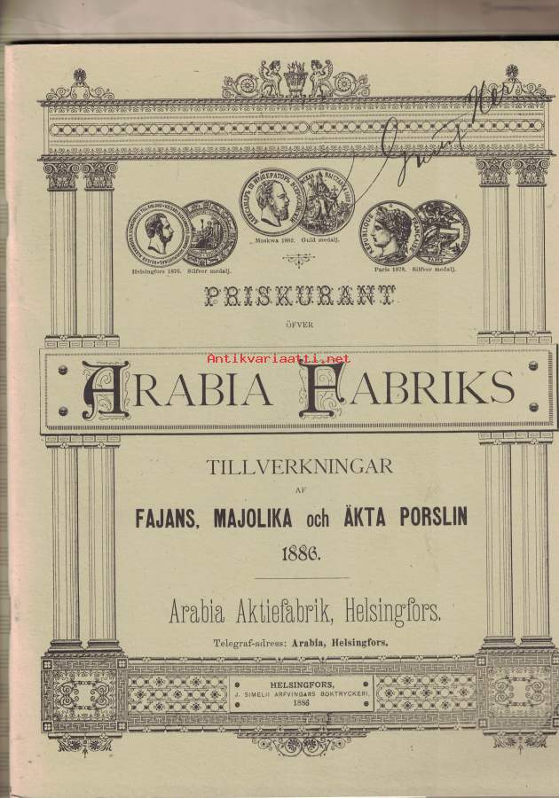 Priskurant öfver Arabia fabriks - tillverkningar af fajans, majolika och äkta porslin 1886