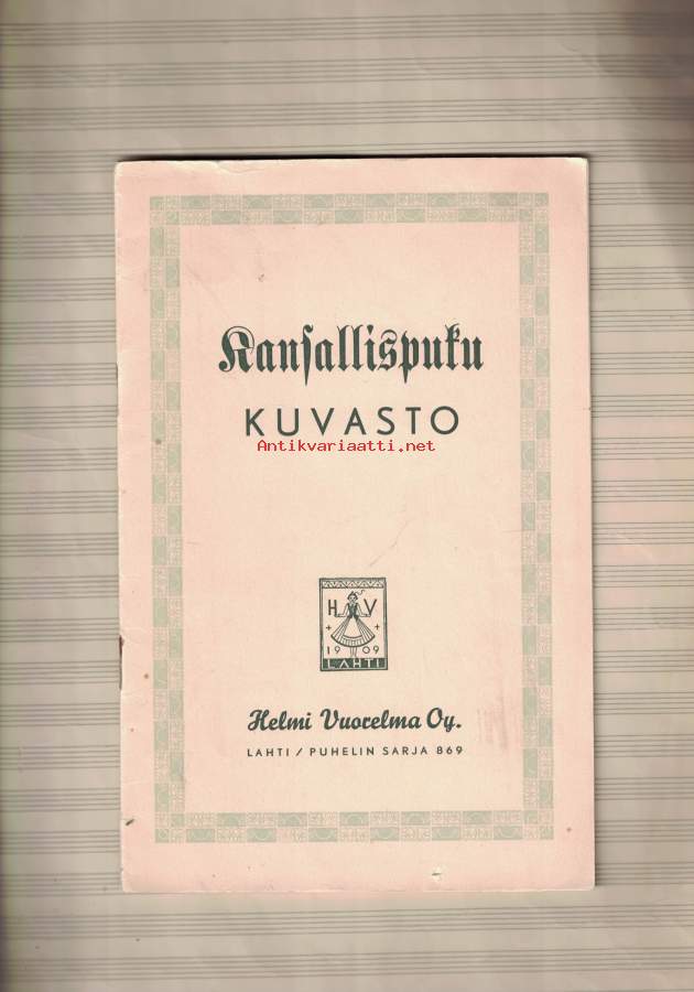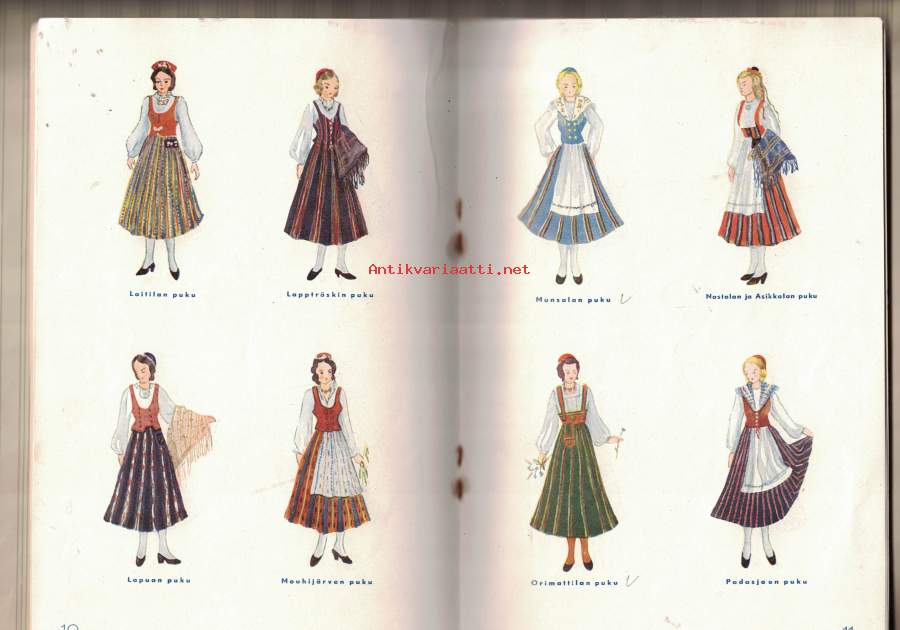 Mukana erillinen hinnasto, jossa eritelty kahdentoista kansallispuvun hinta, tässä ei vuosilukua.-Pieni Helposti kuori