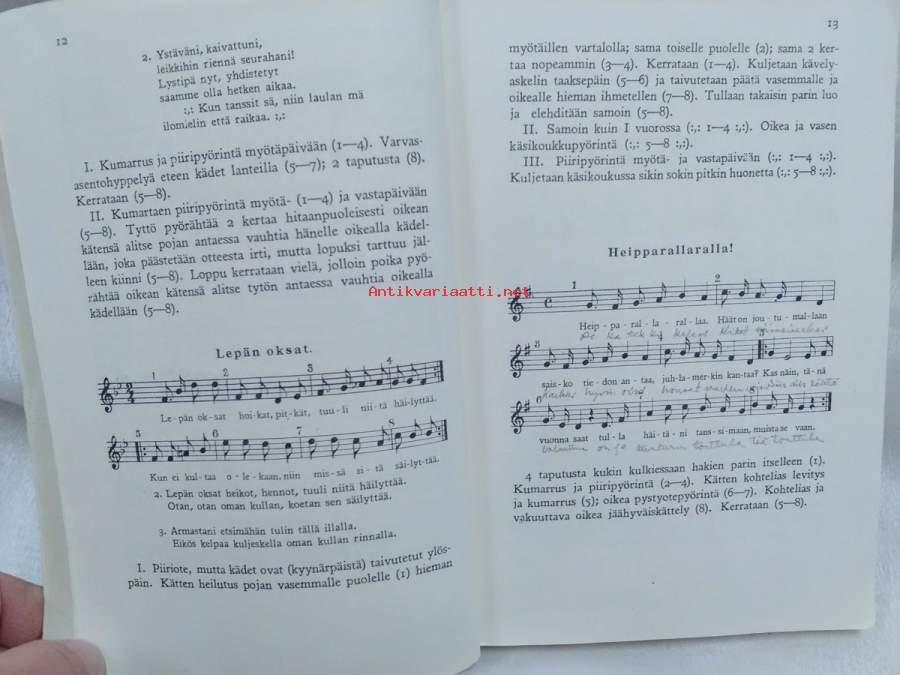 Suomen Naisten Liikuntakasvatusliiton julkaisusarja XXVII, omistus, merkintöjä, kuvakansissa kulumaa, selässä rikkoumaa