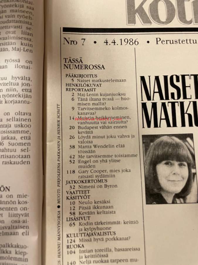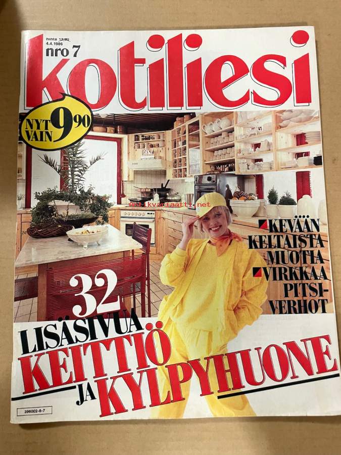 Kotiliesi 1986 nr 7, Martta Wendelin, kevään keltaista, 32 lisäsivua keittiöt ja kylpyhuone, Gary Cooper