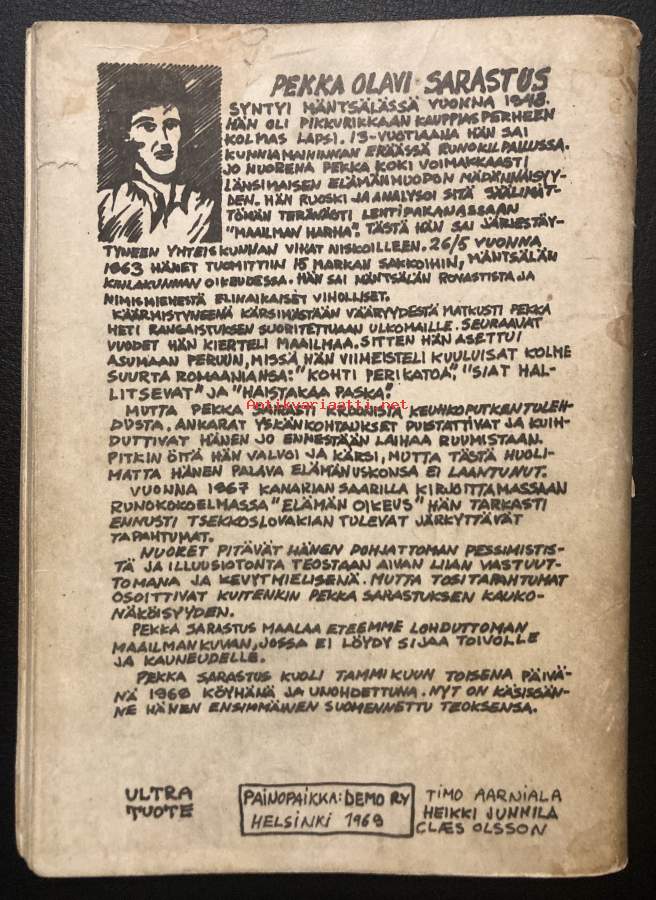 Harvinainen kotimainen sarjakuva vuodelta 1969. Painos ollut laajuudeltaan 620 kappaletta. Koko on n. 17cm x 12cm.