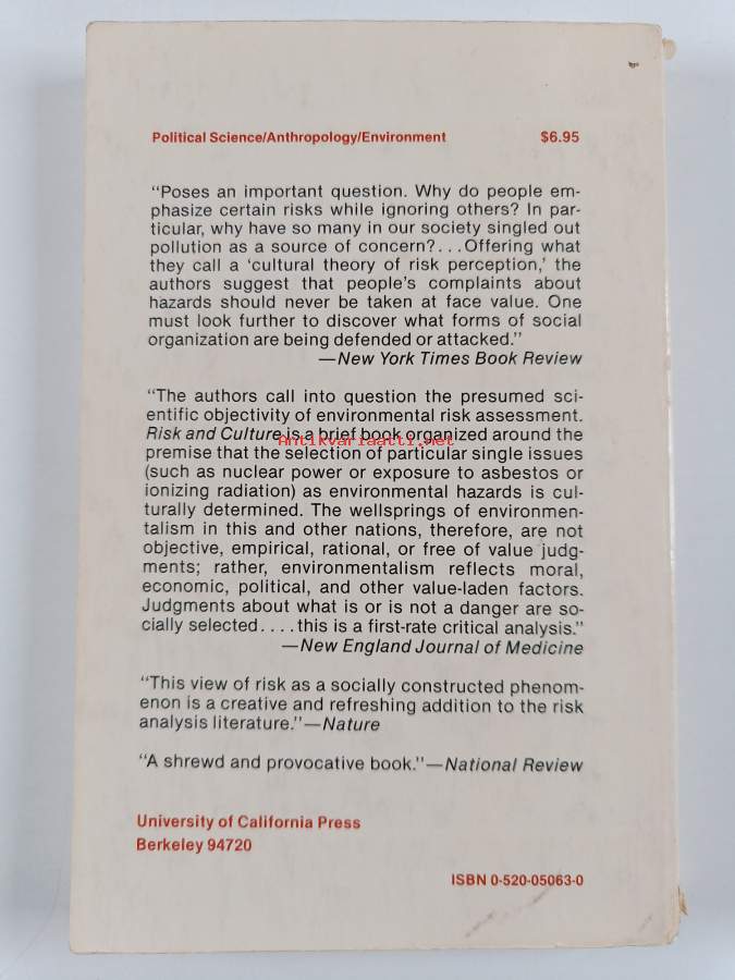 Risk and culture : an essay on the selection of technological and environmental dangers