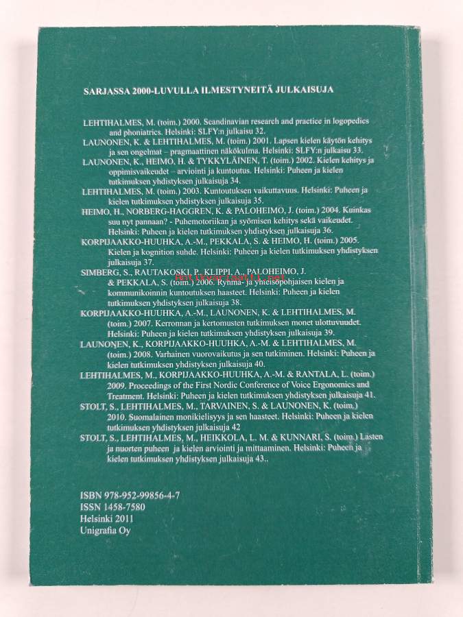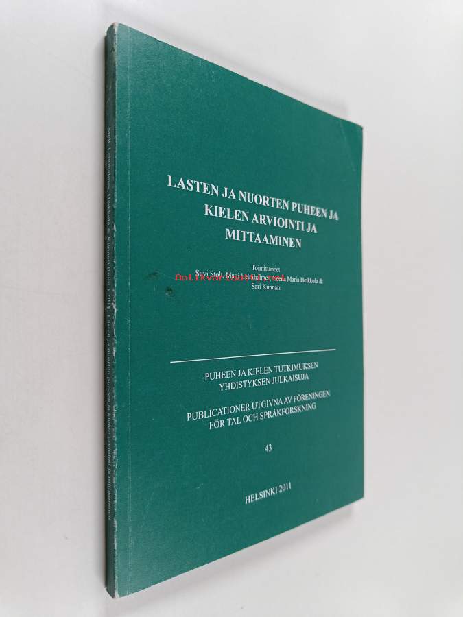 Muu(t) tekijä(t): Matti Lehtihalmes, Sari Kunnari ym.Merkinnät: omistajamerkintäSarja: Puheen ja kielen tutkimuksen yhdistyksen julkaisuja 43Asiasanat: arviointi, nuoret, oppiminen, kielen omaksuminen, mittaus, kielitaito, kielellinen kehitys, kielen oppiminen, puheentuotto, lapset (ikäryhmät), kieli ja kielet, puhe (puhuminen), communication, inlärning, barn (åldersgrupper), Ungdomar, språk, Adolescent, Child, omaksuminen, språkutveckling, Language Disorders, mätning, språktillägnande, språkkunskap, utvärdering, språkinlärning, tillägnelse, tal (prat), talproduktion, language development