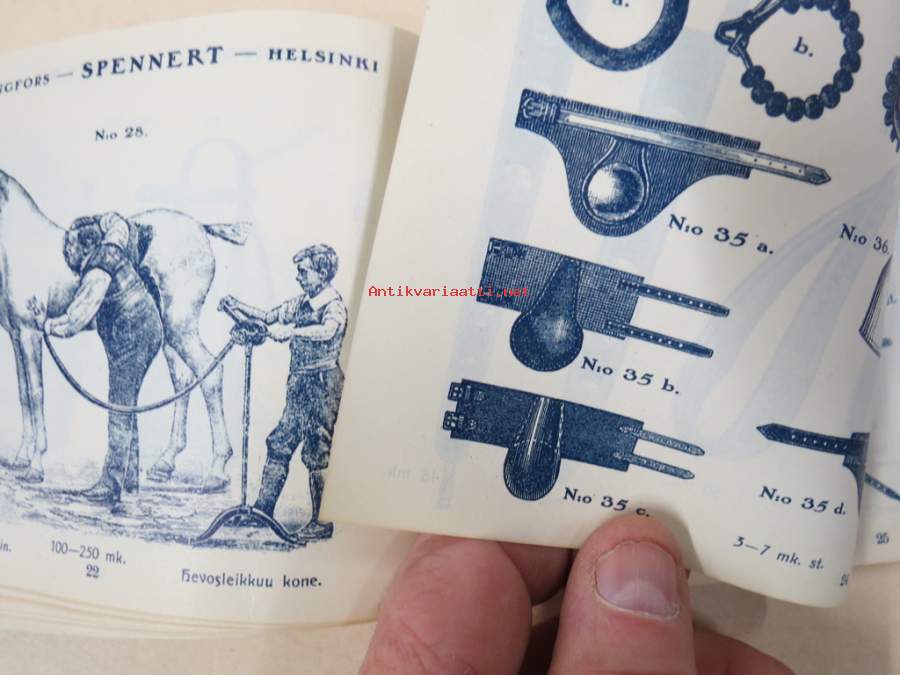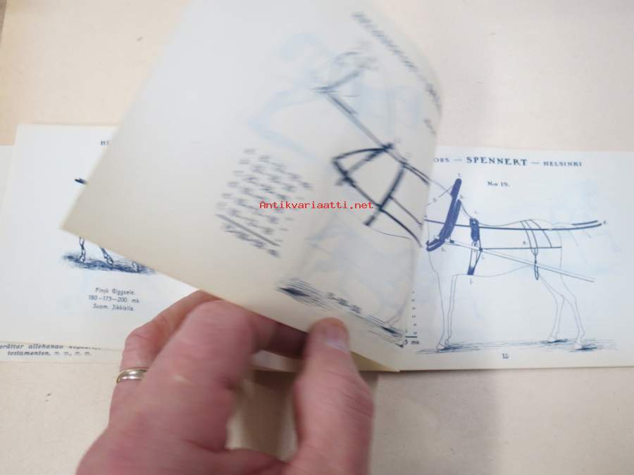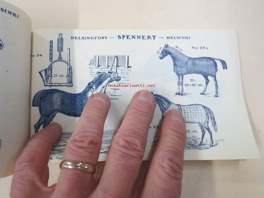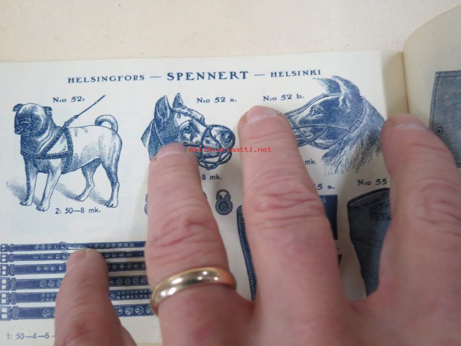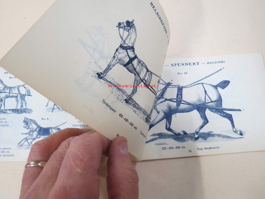 11 x 18 cm luettelo, erilaisia varusteita etupäässä hevosille, jotain myös ihmisille ja koirille...
