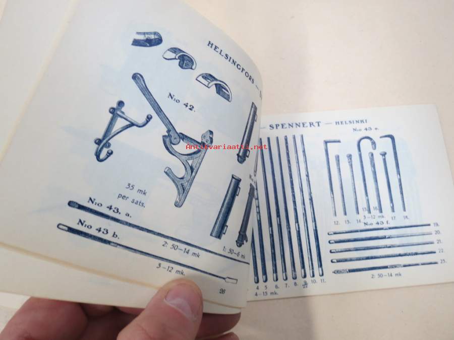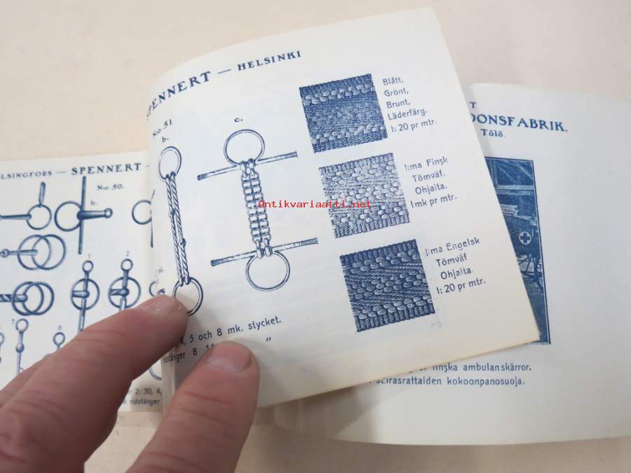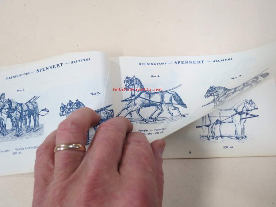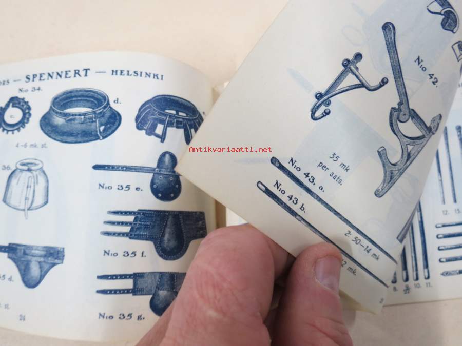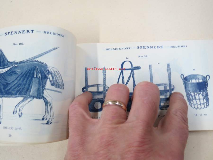 11 x 18 cm luettelo, erilaisia varusteita etupäässä hevosille, jotain myös ihmisille ja koirille...