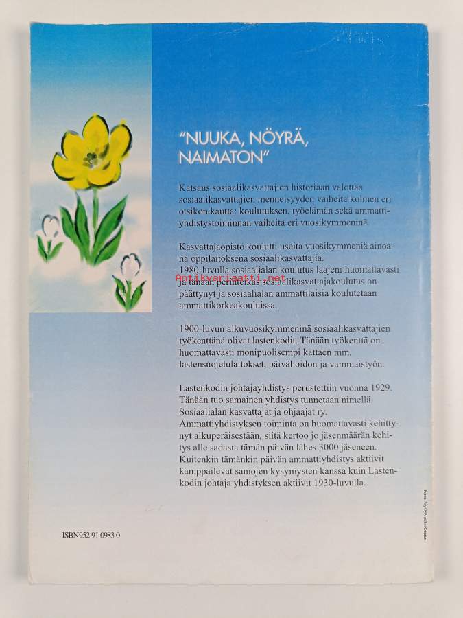 Merkinnät: omistajamerkintä leikattu pois etulehden ylälaidastaAsiasanat: historia, järjestöhistoriikit, sosiaalihistoria, järjestöt, koulutus, työelämä, lastensuojelu, hoitotyö, sosiaalityö, ammattiyhdistykset, kasvatus, kasvatushistoria, ammatit, työ, ammattiyhdistystoiminta, henkilöstö, päivähoito, ammatillinen koulutus, sosiaaliala, perhetyö, työn sisältö, lastenkodit, sosiaalialan oppilaitokset, dagvård, socialhistoria, arbetsliv, organisationshistoriker, utbildning, fackföreningar, arbete, barnskydd, yrkesutbildning, familjearbete, fackföreningsverksamhet, föreningar, yrken, pedagogikens historia, personal, ammattiyhdistyshistoriat, socialt arbete, barnhem, sosiaalikasvattajat, socialsektorn, arbetsinnehåll, socialpedagoger, socialläroinrättningar