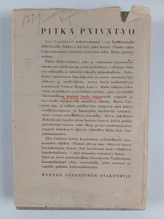 Hyvä. Tarkempi kuntoluokka: K3- ; Hieman kulumaa reunoilla ja kulmissa, pienoista repeämää selkämyksen alakulmassa. Kansipaperin kunto: repeämiä/kulumaa / nimiölehteen kiinnitetty neliapila