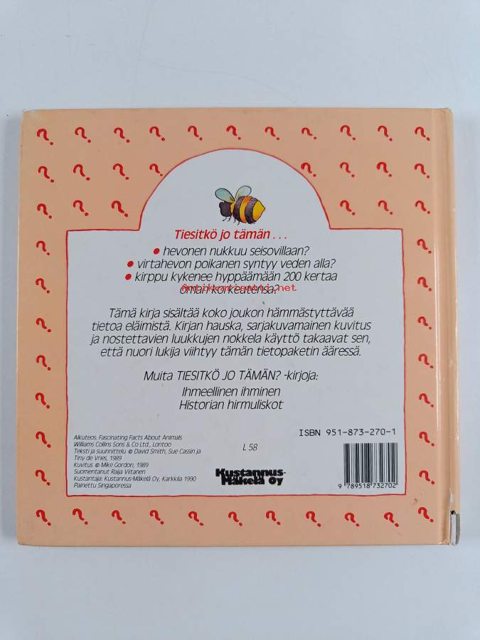 Muu(t) tekijä(t): Raija Viitanen, Mike Gordon ym.Sarja: Tiesitkö jo tämän?Alkuteos: Fascinating facts about animalsAsiasanat: eläimet, lastenkirjallisuus, kuvakirjat