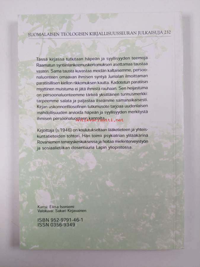 Sarja: Suomalaisen teologisen kirjallisuusseuran julkaisuja 232Asiasanat: usko, synti, syyllisyydentunne, paha, hyvä, vastuu, häpeä, armo, persoona, toivo, vapaa tahto, syntiinlankeemus