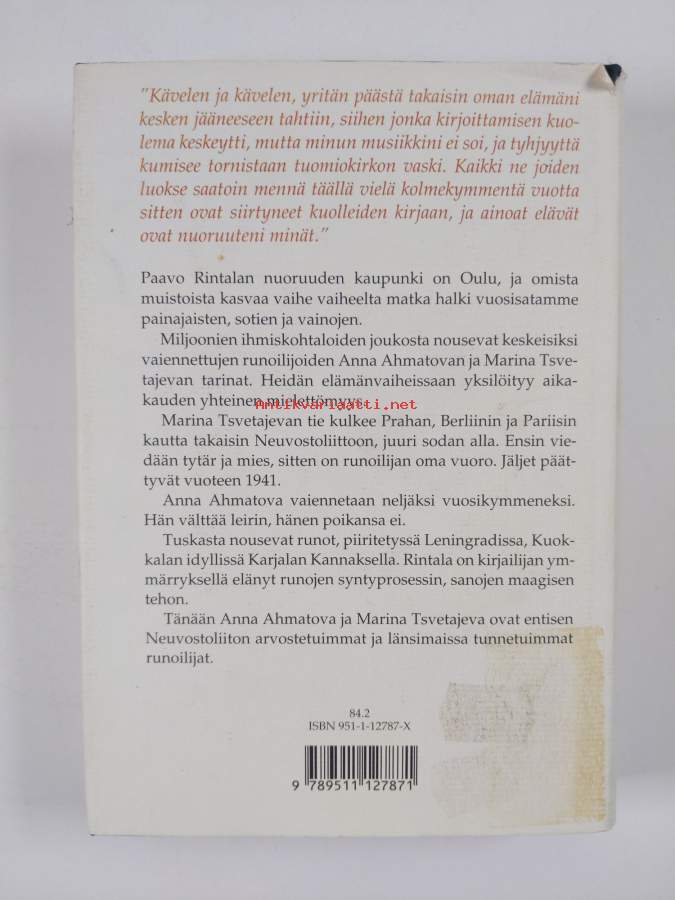 Hyvä. Tarkempi kuntoluokka: K3+ ; Pienoista kulumaa reunoilla ja kulmissa, selkämyksessä hieman vinoutta. Kansipaperin kunto: joitain repeämiä/kulumaa