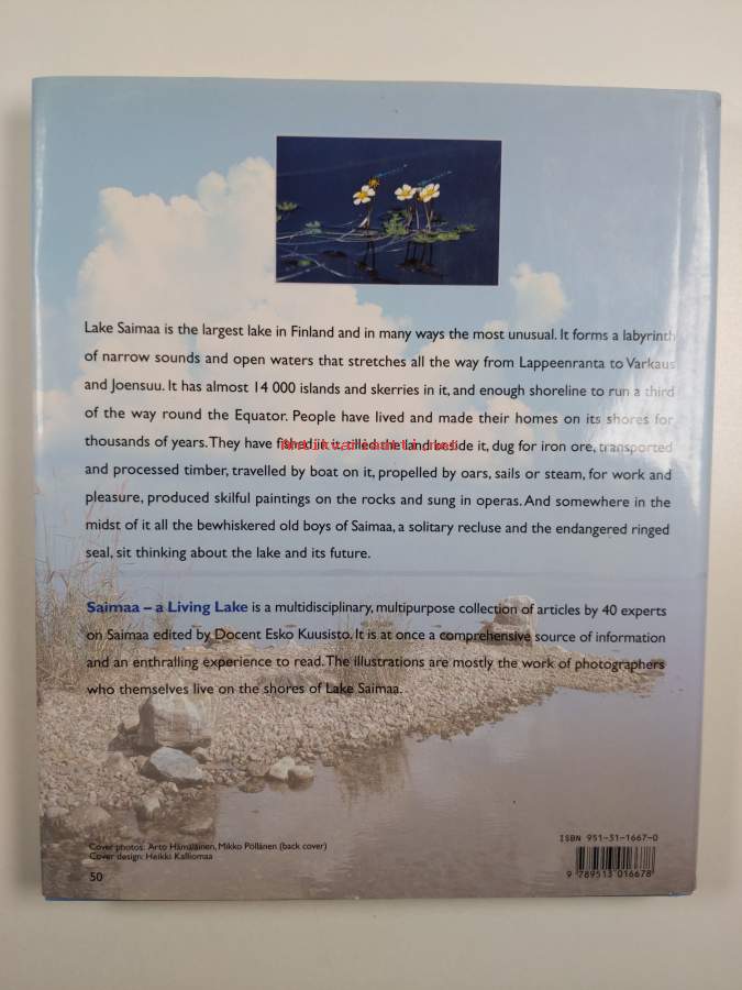 Muu(t) tekijä(t): Malcolm Hicks, Esko KuusistoAsiasanat: kasvisto, eläimistö, luonto, historia, luonnonsuojelu, kalastus, vesistöt, järvet, luonnontutkimus, vedenlaatu, saimaannorppa, sisävesiliikenne, naturen, fiske, fauna, flora (växtvärld), naturskydd, vattenkvalitet, vattendrag, naturforskning, sjöar, insjöfart, saimenvikare