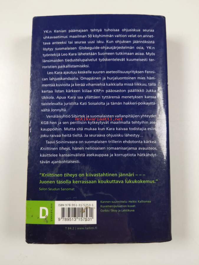Tyydyttävä. Tarkempi kuntoluokka: K2+ ; Pientä kulumaa kansissa, hieman taipumaa kulmissa, pienoista repeämää selkämyksen alakulmassa, selkämyksessä vinoutta, selkämyksessä lukutaittumaa