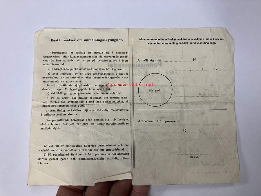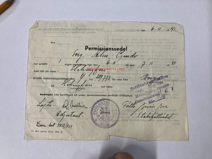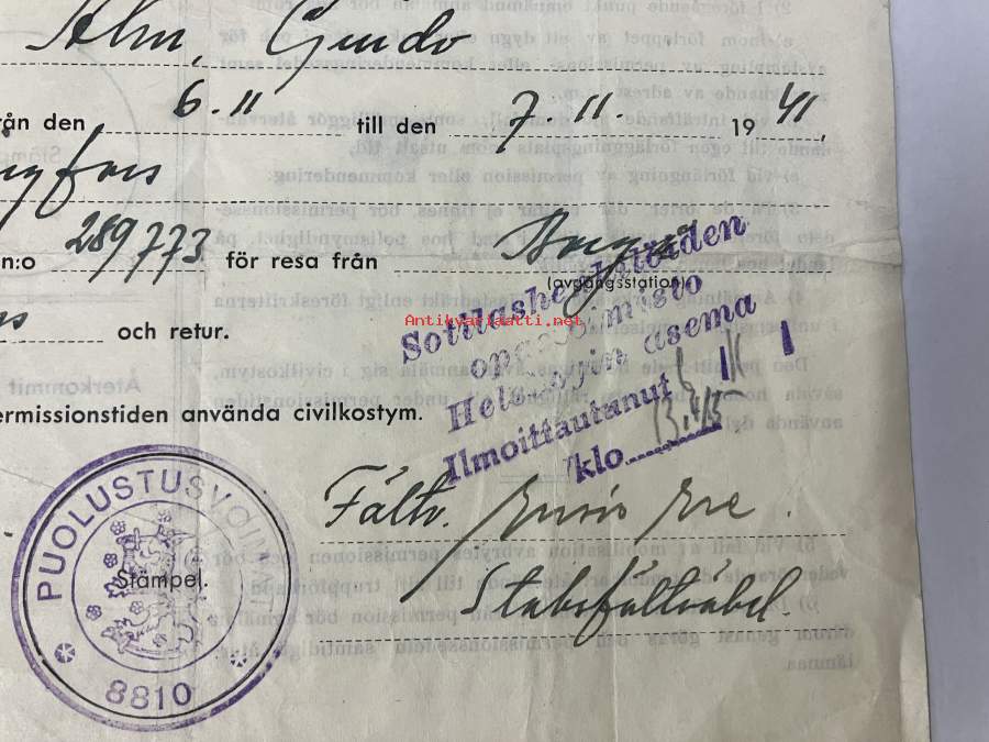 Permissionssedel Serg. Guido Alm... 7.11.1941 Borgå till Helsingfors tur och retur -lomatodistus