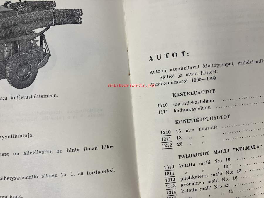Palokalustotehdas Oy Veljekset Kulmala Ab Hinnasto nr 1 /1959 -paloautot, -pumput ym. paloalan kalustoa
