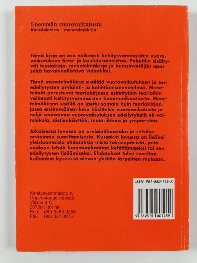 Muu(t) tekijä(t): Aulikki Virtanen, Cecilia OlssonMerkinnät: omistajamerkintäAlkuteos: Kommunicera meraAsiasanat: elämänlaatu, viestintä, kehitysvammaiset, erityisopetus, kuntoutus, vuorovaikutus, opetus, opetusmenetelmät, sosiaaliset taidot, vammaisuus, erityispedagogiikka, toimintakyky, motoriikka