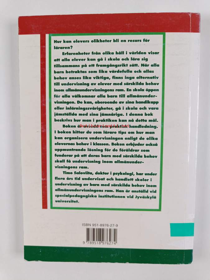 Alkuteos: Kaikille avoimeen kouluunAsiasanat: integraatio, vammaiset, erityisopetus, opetus, koulut, oppilaat, yksilöllisyys, erityispedagogiikka, opetussuunnitelmat, erilaisuus, inkluusio, opetustavoitteet, koulunkäynti, skolan, elever, olikhet, undervisning, integration, specialundervisning, specialpedagogik, personer med funktionsnedsättning, skolgång, individualitet, läroplaner, pedagogik, undervisningsmål, elever med särskilda behov