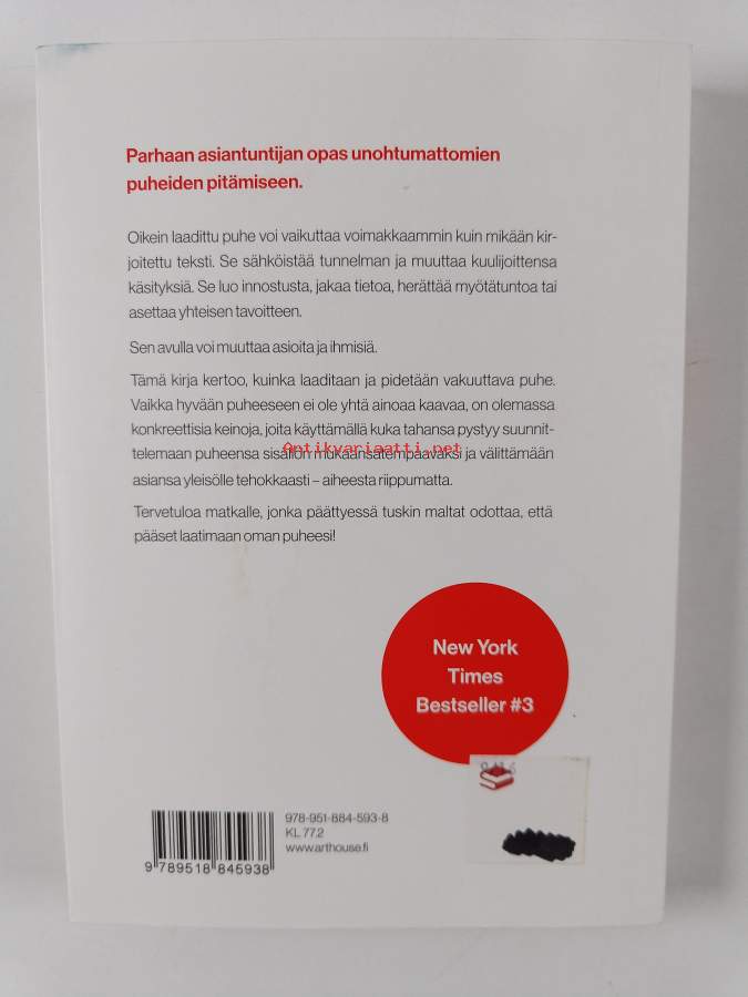 Muu(t) tekijä(t): Veli-Pekka (suom.) KetolaAlkuteos: Ted talks : The Official TED Guide to Public SpeakingAsiasanat: puhetaito, puheet, puheviestintä, suullinen ilmaisu