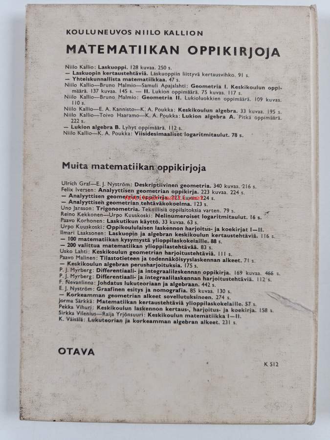 Geometria. 1, Keskikoulun oppimääräKirjaHenkilö Kallio, Niilo, 1890-1968. ; Malmio, BrunoOtava 1934.
