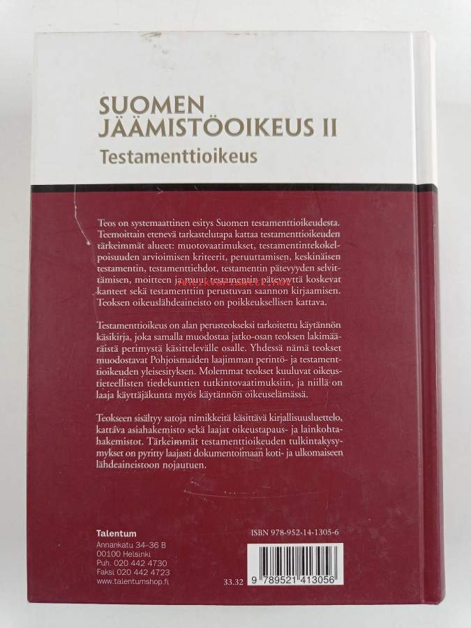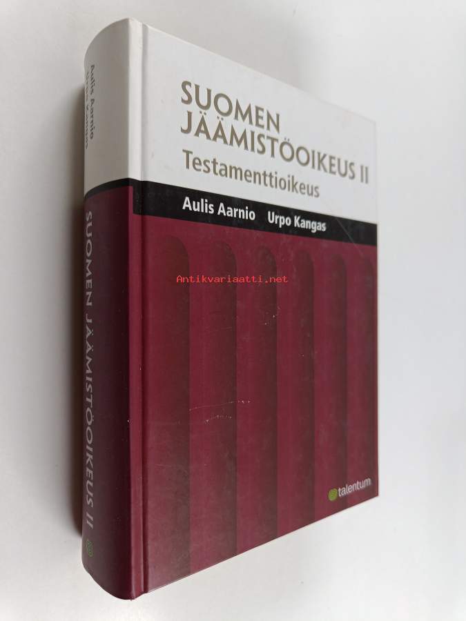 Muu(t) tekijä(t): Urpo KangasMerkinnät: omistajamerkintä leikattu pois etulehden ylälaidastaSarja: Suomen jäämistöoikeus 2Asiasanat: arviointi, perintöoikeus, testamentti, oikeustapaukset, jäämistöoikeus, hovioikeudet, oikeustoimi, omistusoikeus, perinnöt, testamenttioikeus, pätevyys, hoitotahto, edunvalvojat, tiedoksianto, oikeustoimikelpoisuus, pesänjako, arvsrätt, kansainvälinen perintöoikeus, kvarlåtenskapsrätt, hallintaoikeus, testamentsrätt