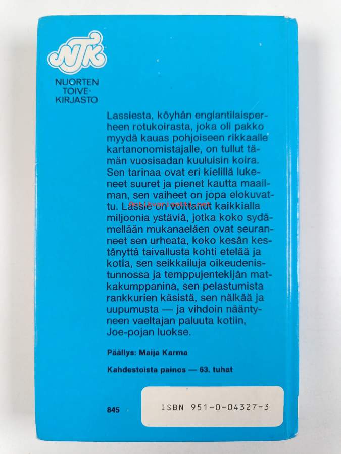 Muu(t) tekijä(t): T J KivilahtiMerkinnät: omistajamerkintäSarja: Nuorten toivekirjasto 114Alkuteos: Lassie come-homeAsiasanat: koiratarinat