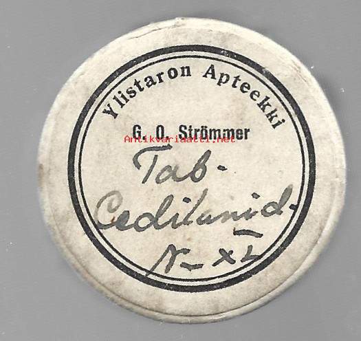 Ylistaron Apteekki - Tab Cedilanid - tyhjä pilleripurkki pahvia 35x15 mm - lääkepakkaus apteekki