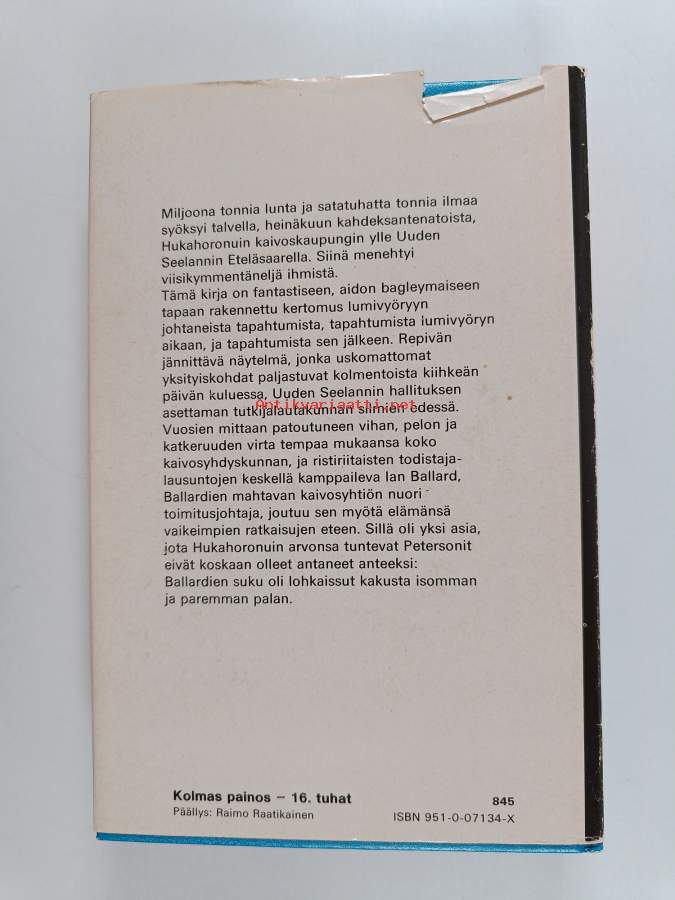 Hyvä. Tarkempi kuntoluokka: K3- ; Hieman kulumaa kansissa, pienoista rispaantumaa kulmissa, selkämyksessä hieman vinoutta. Kansipaperin kunto: joitain repeämiä/kulumaa
