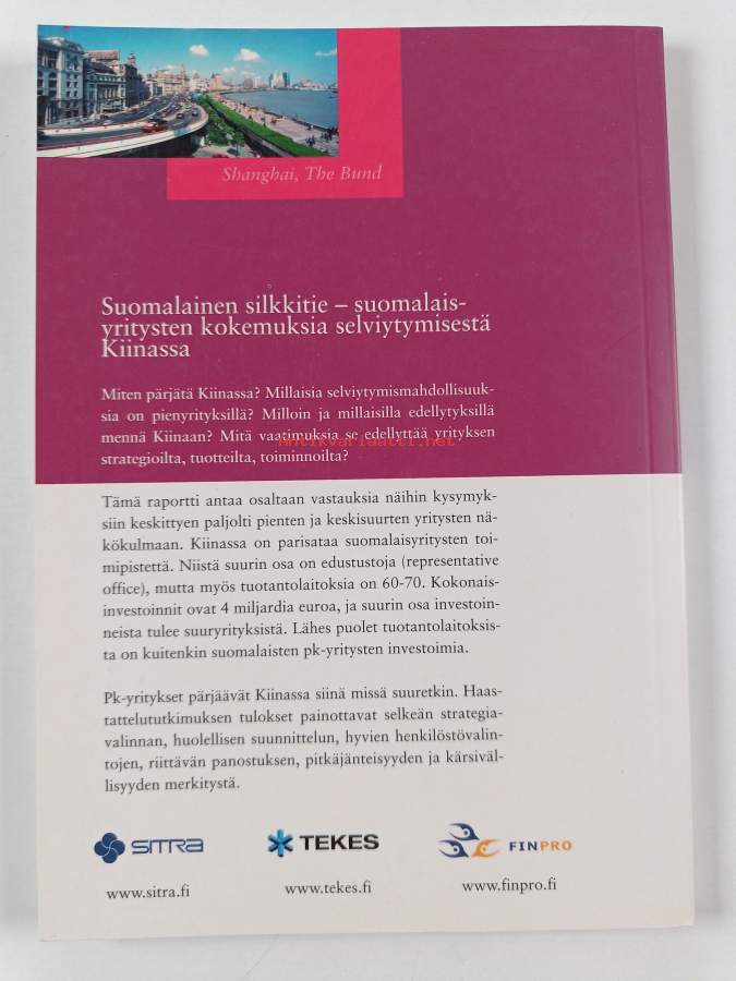 Muu(t) tekijä(t): Ilpo KaislaniemiAsiasanat: liike-elämä, kansainvälistyminen, yritykset, yritystoiminta, yrityskulttuuri, suomalaiset, kokemukset, Suomi, selviytyminen, ulkomaankauppa, kansainvälinen kauppa, pienet ja keskisuuret yritykset, kulttuurierot, investoinnit, ulkomaiset investoinnit, markkinat, kiinalaiset, markkinat (taloustiede), etabloituminen