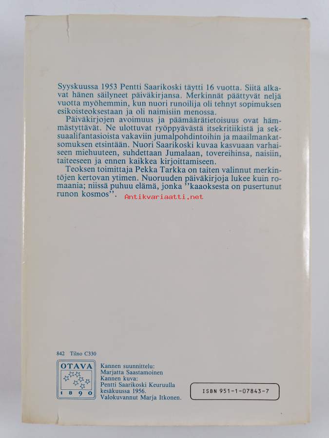 Hyvä. Hieman kulumaa kansissa, selkämyksessä hieman vinoutta. Kansipaperin kunto: jonkin verran kulumaa/pienoisia repeämiä