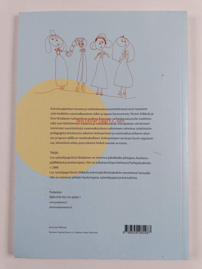 Muu(t) tekijä(t): Kirsi NivalainenAsiasanat: lapsuus, työyhteisöt, vuorovaikutus, kasvatus, oppiminen, pedagogiikka, päivähoito, varhaiskasvatus, päiväkodit, pienryhmät, tiimityö, leikkiminen, toimintakulttuuri, lapset (ikäryhmät)