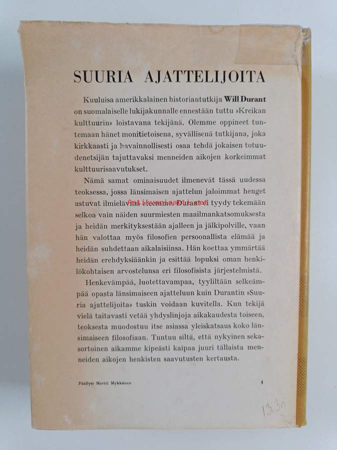 Muu(t) tekijä(t): J. A. HolloMerkinnät: omistajamerkintä (leima)Alkuteos: The Story of Philosophy : The Lives and Opinions of the Greater PhilosophersAsiasanat: filosofia, filosofit