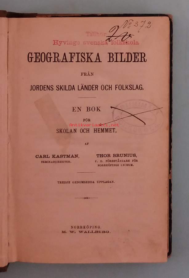 Tämä maantieteellinen tietokirja on suunnattu kouluille ja kotilukemistoksi. Se edustaa 1800-luvun lopun pedagogista kirjallisuutta, jossa yhdistyvät kansantieteelliset kuvaukset, maantieteelliset tiedot ja moraalikasvatus. Ex-koulukirja (Hyvinge svenska folkskola), leima ja numerointi. Denna geografiska fackbok på svenska är avsedd för skolor och hemmabruk. Den representerar pedagogisk litteratur från slutet av 1800-talet, där etnografiska skildringar, geografisk kunskap och moralundervisning förenas. Verket är den tredje genomgångna upplagan, utgiven av M. W. Wallberg i Norrköping. Dimensiot 10 ¤ 12 cm