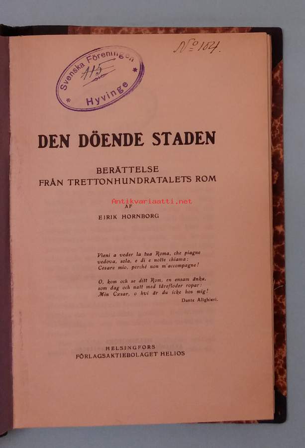Historiallinen romaani sijoittuu 1300-luvun Roomaan, aikaan jolloin kaupunki kamppaili poliittisen hajaannuksen, hengellisen kriisin ja menneen loiston varjon kanssa. Teos kuvaa Roomaa kuin Dante Alighierin runossa: "leskenä, yksinään, itkien päivin ja öin" – odottaen pelastajaa, keisaria, joka ei saavu. Vuoden 1908 painos on teoksen ensipainos. Denna historiska roman utspelar sig i 1300-talets Rom och är skriven på svenska. Verket utgavs i Helsingfors år 1908 av Förlagsaktiebolaget Helios. Det innehåller ett verscitat av Dante Alighieri, som fungerar som en symbolisk inledning till Roms politiska och moraliska förfall. Dimensiot 20 ¤ 14 cm.